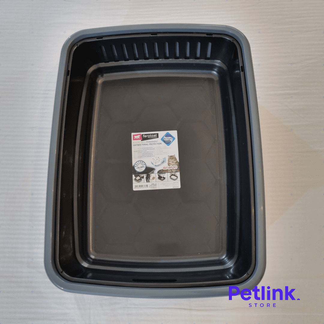FERPLAST ARENERO ABIERTO CON SISTEMA DE TAMIZ EVITA DESPERDICIO PARA GATOS MODELO ARIEL 10 COLOR GRIS CON NEGRO